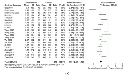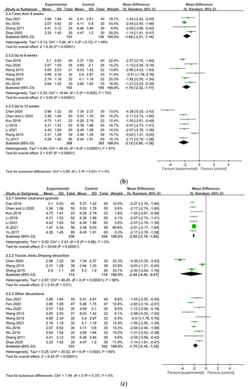 Pruritus severity was assessed by a VAS score in 21 studies (Figure 3a) [21,24,27,28,30,35,39,40,41,42,43,44,45,46,47,51,54,55,58,62,64]. When compared to controls, CHM reduced VAS scores significantly (mean difference [MD] −1.98, 95% CI −2.23 to −1.73). Depending on duration of dialysis, patients were treated with CHM, CHM was shown to significantly reduce VAS scores after <8 weeks of treatment (MD −1.68, 95% CI −2.21 to −1.16), ≥8 weeks of treatment (MD −1.74, 95% CI −2.32 to −1.17), and ≥12 weeks of treatment (MD −2.12, 95% CI −2.85 to −1.39) (Figure 3b). The longer the dialysis patients were treated with CHM, the more reduction in VAS scores was shown. Moreover, a variety of Chinese herbal formulas significantly reduced VAS scores: Touxie-Jiedu-Zhiyang decoction (MD −2.44, 95% CI −4.40 to −0.47), UCG (MD −2.05, 95% CI −2.19 to −1.92), and other decoctions (MD −1.75, 95% CI −2.16 to −1.35) (Figure 3c).