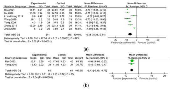 The Duo and Dirk R. Kuypers itching scales for pruritus assessment were reported by seven [26,34,35,53,54,55,63] and two studies [31,36], respectively. CHM significantly reduced pruritus symptoms according to both the Duo (MD −6.11, 95% CI −8.28 to −3.94) and Dirk R. Kuypers (MD −5.12, 95% CI −6.49 to -3.75) itch-intensity scales (Figure 4a,b). Heterogeneity across trials was high for VAS scores (I2 = 75%, p < 0.00001, VAS scores ≥8 weeks of treatment (I2 = 70%, p = 0.005), ≥12 weeks of treatment (I2 = 87%, p < 0.00001), for the Touxie-Jiedu-Zhiyang decoction (I2 = 96%, p < 0.00001), for other decoctions (I2 = 65%, p = 0.0002), and relative to pruritus scores using the Duo itch-intensity scale (I2 = 87%, p < 0.00001). However, heterogeneity of VAS scores (pruritus severity) was not significant after <8 weeks of treatment with CHM (I2 = 49%, p = 0.12) or with UCG (I2 = 0%, p = 0.88); similarly, pruritus scores based on the Dirk R. Kuypers itch-intensity scale was also not significant (I2 = 0%, p = 0.74).