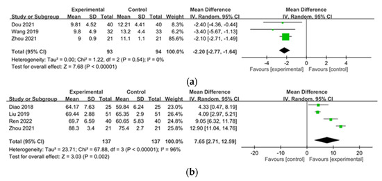 We assessed sleep quality and quality of life with the PSQI and QOL scale in three [54,55,68] and four studies [31,49,61,68], respectively. The PSQI declined significantly in UP patients after CHM treatment (MD −2.20, 95% CI −2.77 to −1.64), and the score of the QOL scale increased significantly (MD 7.65, 95% CI 2.71 to 12.59) (Figure 6a,b). Heterogeneity was high for the QOL scale (I2 = 96%, p < 0.00001), whereas heterogeneity for PSQI was not significant. (I2 = 0%, p = 0.54).