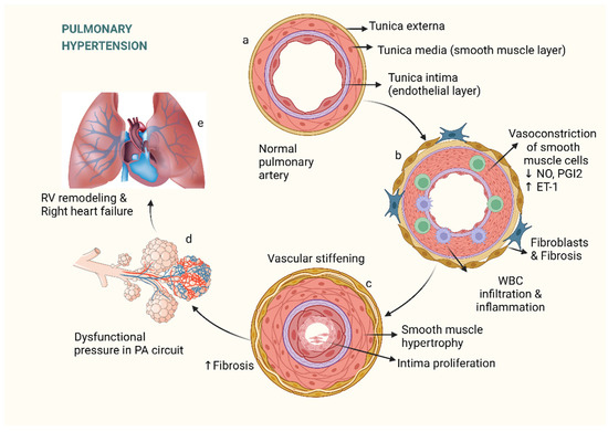 (a) Cross-section of normal pulmonary artery with tunica intima, media, and externa. (b) Dysregulated cellular metabolic events lead to decreased (↓) vasodilator production (nitric oxide [NO] and prostacyclin [PGI2]) and overproduction (↑) of vasoconstrictors (endothelin-1 [ET1]), leading to increased and sustained vasoconstriction via smooth muscle contraction. Pulmonary vascular remodeling and inflammation ensues (c) Sustained vasoconstriction leads to smooth muscle hypertrophy. Proinflammatory cytokines, serotonin, bone morphogenetic proteins (BMPs), and members of the transforming growth factor (TGF-β) family lead to proliferation of the extracellular matrix and fibroblasts, causing fibrosis and resulting in vascular stiffening and creation of plexiform lesions (d) Dysfunctional pressure regulation in the pulmonary circuit leads to elevated mPAP and abnormal RV-PA coupling. (e) PAH eventually culminates in right-heart failure.
