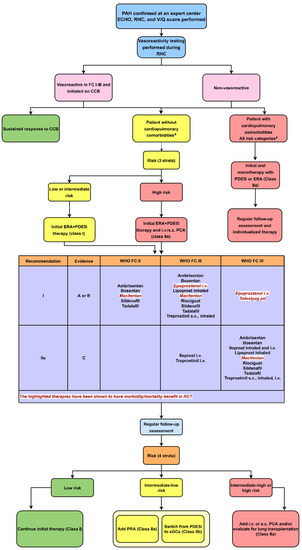 For PAH patients stratified as low-risk, treatment-naïve patients in FC I–II, guidelines historically recommended monotherapy with a single oral agent, with the sequential addition of medications if clinical improvement was not met. A meta-analysis of 35 RCTs demonstrated a benefit of PAH specific monotherapy over placebo with respect to 6MWD and quality of life. There are currently no studies comparing different classes of medications as monotherapy available [28,29].