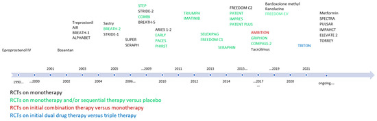 In 2021, the first study comparing dual therapy to triple therapy (macitentan, tadalafil, and placebo vs. macitentan, tadalafil, and selexipag) in treatment-naïve PAH patients was published (Figure 3) [46]. TRITON was a 26 week RCT in PAH FC II–III patients with a primary endpoint of change in PVR. The study did not find a significant difference between the two treatment arms and did not support triple oral therapy over dual oral therapy in this population. However, there was a signal of benefit in the triple therapy arm on longer follow up and this remains to be conclusively established in future trials. In high-risk patients or those refractory to treatment, initial triple therapy with the inclusion of IV prostacyclin therapy is recommended [19,21].