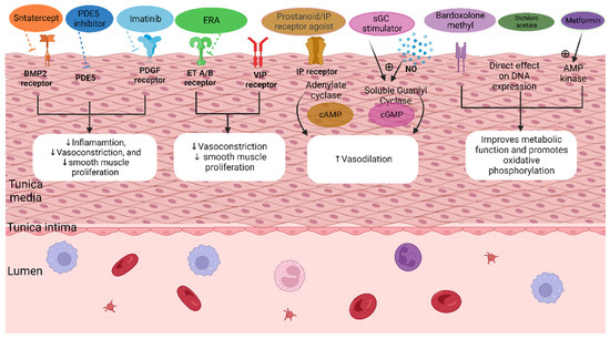 Mechanism of action (MOA) of specific PAH therapies at the receptor level. ↓ = decreased, ↑ = increased.