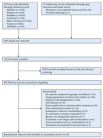 Based on a systematic search approach, 20,796 records were identified. After deduplication and screening based on title and abstract, we identified 492 articles for full-text review. Of these, 23 randomized clinical trials (21 parallel-group [14,17,18,19,20,21,22,23,24,25,26,27,28,29,30,31,32,33,34,35,36] and two cross-over [37,38] trials) fulfilled the study inclusion and exclusion criteria, and were included in this systematic review (Figure 1).