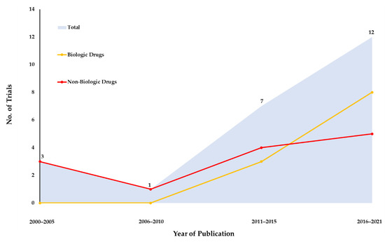 The included trials were published between the years 2000 and 2021. The type of pharmacological intervention was identified as biologic drugs in 12 (52.2%) trials, immunosuppressive drugs in five (21.7%), and others in six (26.1%), which investigated 18 different pharmacological interventions or dosages and one placebo (usual care treatment). Notably, in 2015 and 2021, the number of biological drugs used dramatically increased by 300% and 800%, respectively; the number in 2005 was zero (Figure 2). Meanwhile, the number of non-biological drugs investigated in clinical trials annually revealed little change over time.
