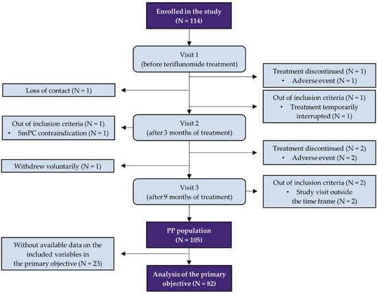 Patient flow according to the STROBE statement. Of the 114 patients enrolled, 9 (7.9%) were excluded from the analysis. The remaining 105 patients represent the per protocol (PP) population presented in the results. For the analysis of the primary objective, only patients who had available data on the included variables (i.e., all questionnaires completed) after 9 months of treatment were included (N = 82).
