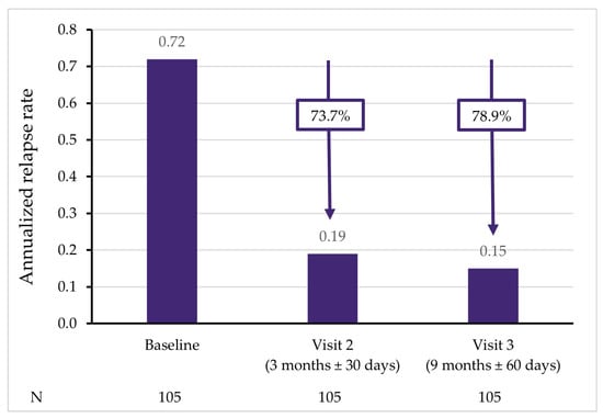 As the lengths of the evaluated periods were different (i.e., three months vs. six months), the relapse rate was annualized to allow for comparisons. The baseline value of the ARR was 0.72 (95% CI: 0.57–0.91); after 3 and 9 months of treatment, it decreased to 0.19 (95% CI: 0.12–0.29) and 0.15 (95% CI: 0.09–0.25), respectively. The relative decrease from the baseline was 73.7% and 78.9% after 3 and 9 months, respectively (Table 3; Figure 2).
