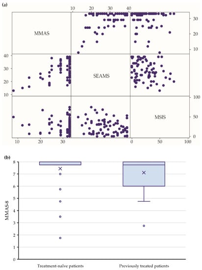 Questionnaire scores relevant to the primary aim after 9 months of treatment (N = 82). (a) Matrix showing observed two-dimensional relationships between patient adherence (MMAS-8), Self-Efficacy in Medication Use (SEAMS), and quality of life (MSIS-29) at 9 months (visit 3). (b) The difference in adherence (MMAS-8) between treatment-naïve and previously treated patients at 9 months (visit 3).