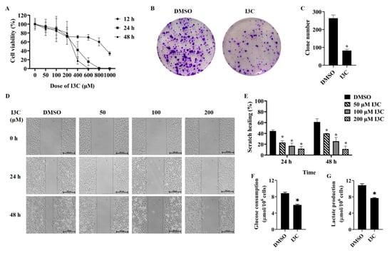 The effects of I3C treatment on cell proliferation, colony formation, migration, and glycolysis in HepG2 cells. (A) The CCK8 assay in HepG2 cells, which were treated with different time and dose from I3C; (B) Colony formation assay after vehicle (DMSO) and I3C treatments. (×40); (C) The number of colonies; (D) Wound scratch assay after vehicle (DMSO) and I3C treatments. (×10); (E) The wounded area, shown as an arbitrary unit. The effects of I3C treatment on the glucose consumption (F) and the lactate production (G) in HepG2 cells. * p < 0.001 vs. DMSO.