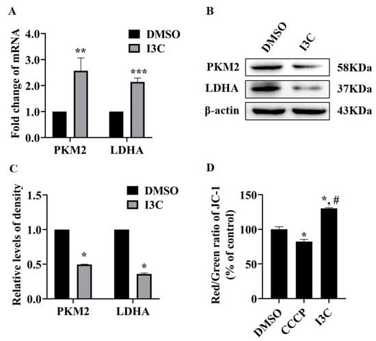 The effects of I3C treatment on the expression of glycolysis-related genes and mitochondrial function in HepG2 cells. (A) Measurement of the mRNA levels (** p < 0.01 vs. DMSO, *** p < 0.001 vs. DMSO) and (B) protein levels of glycolysis-related genes after DMSO (vehicle) and I3C (200 µM for 12 h) treatments; (C) Densitometric analysis for blots shown in (B). * p < 0.05 vs. DMSO; (D) Effects of I3C on MMP. The mitochondrial uncoupler CCCP was used as a control. * p < 0.05 vs. DMSO, # p < 0.05 vs. CCCP.