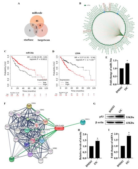 Studies on the molecular mechanism of how I3C treatment inhibited LDHA expression. (A) LDHA-targeted miRNAs were predicted using three databases; (B) Correlation of miR-34a with LDHA expression in hepatocellular carcinoma tissues. Association between the expression levels of miR-34a (C) and LDHA (D) and survival in patients with liver cancer; (E) The effects of I3C treatment on the expression of miR-34a in HepG2 cells. * p < 0.05 vs. DMSO; (F) Prediction of the protein–chemical interaction. (G) The effect of I3C treatment on p53 protein expression; (H) Densitometric analysis for blots shown in (G). * p < 0.05 vs. DMSO; (I) Measurement of the mRNA levels of p53 after treatment with DMSO (vehicle) and I3C. * p < 0.05 vs. DMSO.