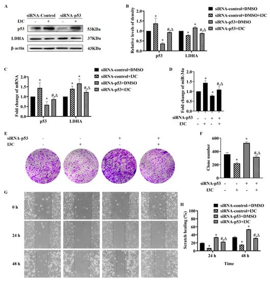 Next, how I3C regulates LDHA-targeted miRNA via p53 was studied in p53 knockdown HepG2 cells. As shown in Figure 4A,B, p53 knockdown upregulated LDHA expression, which was reversed after I3C treatment. As for the mRNA levels of p53 and LDHA, the former was in line with the changes in protein levels, whereas the latter was different, as expected (Figure 4C). The results in Figure 4D demonstrated that I3C treatment reversed the downregulation of miR-34a caused by knockdown of p53. We then performed colony formation and wound scratch assays for phenotype evaluation. The results showed that, compared with the control group, siRNA-p53 promoted colony formation (Figure 4E,F) and migration (Figure 4G,H) of HepG2 cells, whereas I3C treatment attenuated these promotional effects. These results demonstrate that I3C inhibits LDHA expression via the p53/miRNA-34a axis.