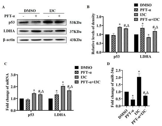 The effects of I3C and p53 inhibitor (PFT-α) on the expression levels of miR-34a and LDHA. (A) The effect on the protein expression of p53 and LDHA; (B) Densitometric analysis for blots shown in (A); (C) Measurement of the mRNA levels of p53 and LDHA; (D) The effect on the expression of miR-34a. * p < 0.05 vs. DMSO, # p < 0.05 vs. PFT-α, Δ p < 0.05 vs. I3C.