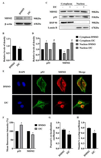 The effects of I3C treatment on MDM2 and p53. (A) The effect of I3C treatment on MDM2 expression; (B) Densitometric analysis for blots shown in (A). * p < 0.05 vs. DMSO; (C) Effect of I3C treatment on the protein levels of MDM2 and p53 in the nucleus and cytoplasm. Lamin B as a loading control for nuclear fraction and HSP90 for cytoplasmic fraction; (D) Densitometric analysis for blots shown in (C). * p < 0.05 vs. Cytoplasm DMSO, # p < 0.05 vs. Nucleus DMSO; (E) The subcellular localization of MDM2 and p53 with immunofluorescence staining (×40); (F) Analysis of the mean intensity of immunofluorescence; (G) Pearson’s correlation coefficiency analysis; (H) Manders’ Colocalization Coefficiency analysis. * p < 0.05 vs. DMSO.