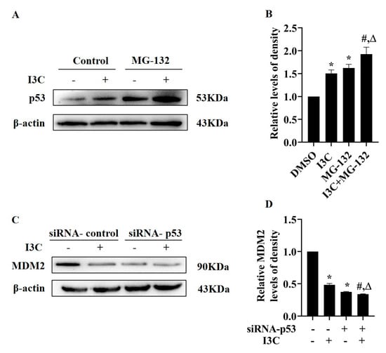 The effect of I3C on the stabilization of p53 by MDM2. (A) The effect of combined I3C and MG-132 on the expression of p53; (B) Densitometric analysis for blots shown in (A). * p < 0.05 vs. DMSO, # p < 0.05 vs. I3C, Δ p < 0.05 vs. MG-132; (C) The effect of I3C on MDM2 expression in siRNA-p53 transfection cells; (D) Densitometric analysis for blots shown in (C). * p < 0.05 vs. siRNA-control+DMSO, # p < 0.05 vs. siRNA-control+I3C, Δ p < 0.05 vs. siRNA-p53+DMSO.