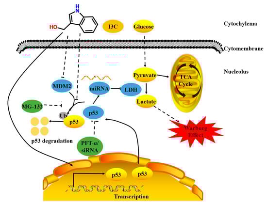 Taken together, we first demonstrated that I3C induces miR-34a, which then targets LDHA, a vital enzyme for aerobic glycolysis, by inhibiting the degradation of p53 by MDM2, thereby downregulating the expression of LDHA and suppressing aerobic glycolysis, leading to growth inhibition of liver cancer cells. Our study provides a theoretical and experimental basis for the plant source of I3C in the treatment of liver cancers (Figure 8). Our results are the first to demonstrate the therapeutic potential of I3C for human liver cancer. Subsequent studies will focus on the in-depth mechanisms of action and the pharmacal kinetics of I3C using mouse models of liver cancer.
