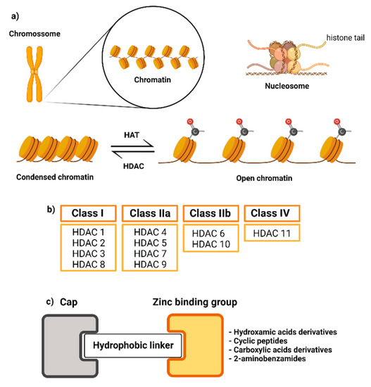 Summary of the mechanism of action of HATs and HDACs, classifications of HDACs, and the scaffold of an HDAC inhibitor (created by using BioRender.com); (a) Mechanism of action of HAT and HDAC; (b) Classification of HDACs; (c) Scaffold of HDAC inhibitor.