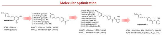 Resveratrol (RVT) (trans-3,5,4′-trihydroxystilbene) (Figure 3) is a natural product with pleiotropic effects, acting on several diseases such as cancer, cardiovascular, metabolic, neurodegenerative, and inflammation [22,23,24,25]. Experiments using nuclear extract of HeLa cells revealed that RVT inhibited all HDAC isoforms at 100 µM but was most active against HDAC-1 and HDAC-10 followed by HDAC-4 and HDAC-9, with 40% and 50% inhibitory values, respectively [26]. In addition to HDAC classes I, II, and IV, RVT also activates SIRT [27]. Dose-dependent experiments showed that RVT increased the deacetylation rate of SIRT1 [27]. The activation of SIRT1 has been reported to be one of the modes of action of RVT for metabolic disorders, cardioprotection, cancer, and neuroprotection [28]. Although RVT is an interesting prototype as an HDAC inhibitor, its poor potency, lack of selectivity, and nonspecific effects due to its bilayer membrane-perturbation effects demand additional efforts to optimize its HDAC inhibition [29,30]. Previously, we have described the potential of RVT analogs as inducers of fetal hemoglobin in sickle cell disease by inhibiting HDACs without membrane perturbation effects [30].