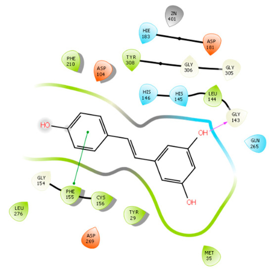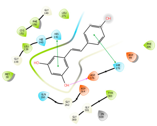 The structural basis for RVT optimization was assisted by molecular docking, which suggested the poses and modes of interaction between HDAC-1 and HDAC-2. For RVT, the DS values were found to be −5.565 and −6.453 against HDAC-1 and HDAC-2, respectively. Both non-ionized and ionized phenol groups were considered in this study. RVT fits into the binding pocket, but we did not observe any interactions with zinc, as previously reported [26]. Figure 4 shows that in the HDAC-1 active site, RVT can interact with residues ARP176 through hydrogen bonding and with HIS141 and HIE178 via π- π interactions. In the HDAC-2 binding pocket (Figure 5), RVT interacts with GLY143 and PHE155 by hydrogen bonding and π-π, respectively. The limited number for RVT explains its poor DS value compared to the optimized compounds described here. Figures S3 and S4 in the Supplementary Materials show the pose of RVT in the active site of HDAC-1 and HDAC-2, respectively.