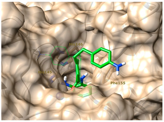 Representation of compound (5) conformation predicted by molecular docking (green line) and accessed during molecular dynamics simulation (green stick), in complex with HDAC-2 (tan surface and ribbons). Highlighted residues PHE155, HIS145, and HIS146, are important for the interaction with compound (5).