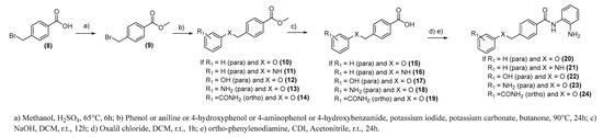 For compounds (20)–(24), 4-bromomethyl benzoic acid (8) was protected by esterification with methanol and sulfuric acid [32] and then reacted through SN2 [33] with phenol, aniline, 4-aminophenol, 4-hydroxyphenol, or salicylamide, to provide intermediates (10)–(14) at yields ranging from 50 to 82%. The final step was the ester hydrolysis and coupling reaction with o-phenylenediamine through coupling agent 1,1-carbonyldiimidazole (CDI), providing compounds (20)–(24) with yields ranging from 10 to 40% (Figure 9).
