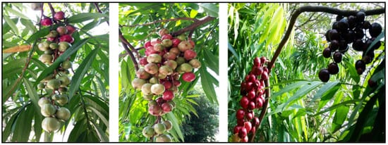 The genus Lepisanthes consists of 26 species []. The geographical distribution of Lepisanthes is broad, extending from India and Sri Lanka in the west to Malaysia, the Philippines, Vietnam, and Papua New Guinea in the east. In Southeast Asia, six of these species are native to Malaysia and can be found flourishing in the wild as well as in orchards (i.e., L. alata, L. amoena, L. fruticosa, L. senegalensis, L. rubiginosa, and L. tetraphylla) [,]. The tropical rainforest is the natural habitat of Lepisanthes species, which grows from lowland to lower montane forest at 1800 m above sea level. It can be also found in streams, wastelands, coastal forests, islands, or in the transition areas between mangroves and dry land. It grows in the organic loam, with the addition of coarse sand or perlite to improve its drainage. Some of these species are still found in the wild, while others are cultivated as ornamental trees and conserved for their delicious fruits []. Lepisanthes is found widely distributed in the aforementioned geographical areas as it grows in a humid climate with year-round rainfall, temperatures between 25 and 28 °C, and a distinct dry season []. It is a shrub tree of about 4–10 m in height. The leaves are imparipinnate with a pair of leaflets and a single terminal leaflet at the terminal end. Its fruits are in bunches like grapes and are shiny red to purple in color. The ripe fruit turns dark purple and contains approximately one to four ellipsoid seeds with fleshy aril. The color of the fruits attracts birds, which help to disseminate the seeds and increase their reproducibility []. Figure 1 shows images of L. alata, also known as Ceri Terengganu in Malaysia.