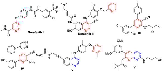 In several clinically used and under-investigation small molecules, including the anti-infective fluoroquinolone drugs and the carbamoyl pyridone HIV-1 integrase inhibitors, the fused and non-fused pyridine motif has been presented as a core structure [,]. Drugs based on 2-pyridone, in particular, have been approved for use in a number of other therapeutic fields, including oncology, cardiovascular, respiratory, and CNS disorders [,,,]. Moreover, kinase inhibitors, such as trametinib [], palbociclib [], duvelisib [], and ripretinib [], are frequently found to contain the 2-pyridone motif. Sorafenib I, which contains a pyridine moiety, is a potent multi-kinase inhibitor that drastically reduced the VEGFR2 transcription in HepG2, HeLa, and A549 cells []. In addition, neratinib II, an irreversible pan-HER kinase inhibitor, contains a cyanopyridine component that has shown therapeutic effectiveness in HER-2-positive and HER-2-mutated breast tumors []. 3-Cyanopyridine derivative III showed high cell-growth-inhibitory effects against human MCF-7breast cancer, NCI-H460non-small cell lung cancer, and SF-268CNS cancer cell lines (IC50 = 0.02, 0.01, and 0.02 µg/mL, respectively) []. Furthermore, the 2-amino-3-cyanopyridine derivative IV showed anti-proliferative activities against HCT116 and Huh7 cell lines (Figure 1). It also adopted a reasonable pose to bind to the ATP-binding site of VEGFR-2 kinase in its inactive DFG-intermediate conformation []. Meanwhile, pyrimidines and fused pyrimidines are important components of nucleic acids. Further, many pyrimidine-based derivatives show significant antitumor and antiproliferative activities [,]. Previously, Pfizer reported that compound V with a benzo-fused pyrimidine ring possessed anti-HER-2 activity lower than 42 nM []. Further, fused pyridopyrimidine analogs are well-known heterocyclic compounds used in cancer chemotherapy [,]. For example, the pyridopyrimidine analog VI was identified as a potent VEGFR-2 inhibitor (Figure 1).