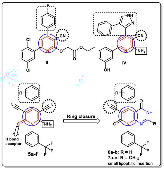 The target compounds were designed taking into consideration the antiproliferative and VEGFR-2/HER-2-inhibitory activity of several reported pyridine- and pyridopyrimidine-based anticancer molecules. Hence, in our research, it was expected that the newly synthesized 2-pyridone based derivatives might exert an anticancer effect in a similar manner to the above-mentioned biologically active pyridines II and IV with enhanced binding affinity (Figure 2). This study aimed to explore two new sets of 3-cyanopyridone-based derivatives. The 3-cyano group was thought to contribute in the perfect binding to the active sites by creating a vital polar hydrogen bond interaction [,].