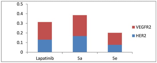 Compounds 5a and 5e, which showed the highest antiproliferative activities toward the MCF-7 cancer cell line, were further selected to examine the in vitro inhibitory activities against VEGFR-2 and HER-2 enzymes. The enzyme inhibitory activities (IC50) are presented in Table 2 and Figure 4.