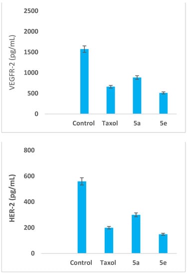 In this study, we further explored the impact of cyanopyridones 5a and 5e on VEGFR-2 and HER-2 expression levels in MCF-7 cells (Figure 5). The results disclosed that both 5a and 5e had interesting profiles for reduction of VEGFR-2/HER-2 expression levels compared to the control cells and the reference drug taxol. Treatment of MCF-7 cancer cells with cyanopyridones 5a and 5e significantly down-regulated the expression levels of VEGFR-2 (884.30 and 510.00 pg/mL, respectively) and HER-2 (299.50 and 148.60 pg/mL, respectively) compared to the untreated control (1573.00 and 559.00 pg/mL) (Table 3). Notably, these results are in parallel with the outputs from the cytotoxicity assay, where the dichloro-substituted derivative 5e was more active than the unsubstituted cyanopyridone derivative 5a.