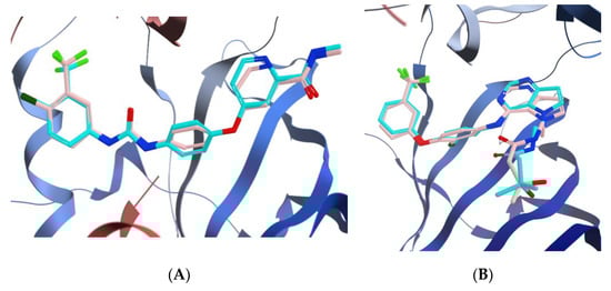 Superimposition of the crystal reference (cyan) and the docking pose (rose) for sorafenib with the VEGFR-2 (A) and TAK-285 in the HER-2 (B) binding sites.