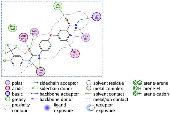 Two-dimensional (2D) diagram for the binding interactions of sorafenib in the VEGFR-2 active site (PDB: 4ASD).