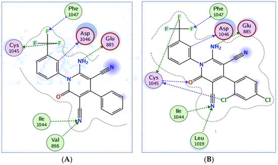 Two-dimensional (2D) interaction diagram of compounds 5a (A) and 5e (B) showing their binding interaction with the VEGFR-2 active site (PDB: 4ASD).