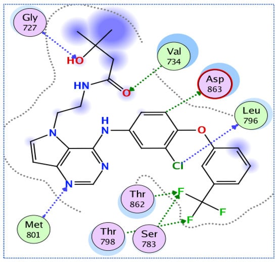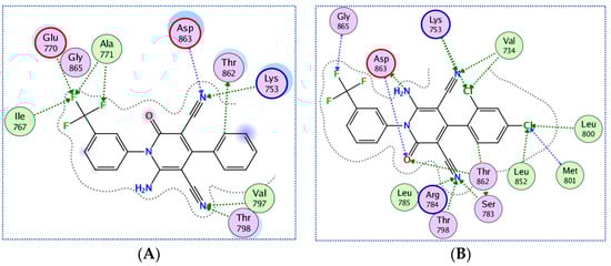 As Figure 10 depicts, compound 5a maintained a strong interaction with the binding site of HER-2 enzyme, forming various interactions. For example, the trifluoromethyl group formed hydrogen bond interactions with Glu770 and Ile767, in addition to two hydrogen bond interactions with Ala771. Moreover, each of the two cyano groups contributed as acceptors for two hydrogen bonds; namely, with Val797, Thr798, Lys753, and Asp863 residues. Finally, the unsubstituted phenyl ring interacted with the key residue Thr862. In alignment with the enzyme assay results, compound 5e was predicted to have the best docking score and the strongest interaction pattern (Figure 10). The cyano group of compound 5e adjacent to the amino group formed two hydrogen bonds with Val734 and Lys 753, while the other cyano group formed three hydrogen bonds with Ser783, Leu785, and Thr798. In addition, the carbonyl group engaged in two hydrogen bonds with Asp863 and Thr862, whilst the amino and trifluoromethyl groups interacted through hydrogen bonding with Asp863 and Gly865, respectively. The 2,4-dichlorophenyl moiety played a central role, giving rise to the superior potency and binding affinity of pyridone 5e through the formation of six hydrogen bond interactions with Val734, Lys 753, Met801, Leu800, Leu852, and Ser783.