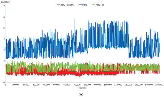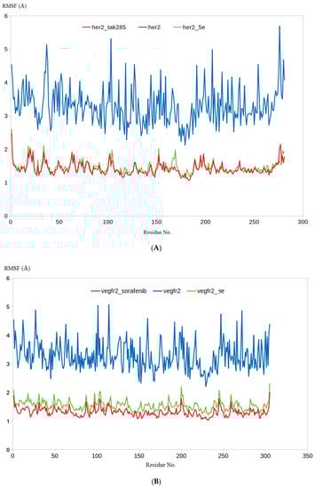 The four complexes 5e–HER-2, 5e–VEGFR-2, TAK285–HER-2, and sorafenib–VEGFR-2, in addition to the Apo form of HER-2 and VEGFR-2, were subjected to molecular dynamic simulation (MDS) for 150,000 ps. The same MDS methodology as previously published by our group was applied in the current study [] (see Supplementary Materials section for further details). Indicative parameters, such as RMSD and RMSF, were calculated to evaluate the stability of all the complexes.