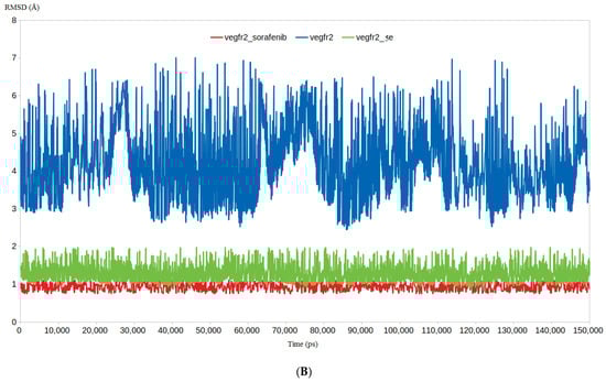 RMSD analysis for the MDSs: (A) HER2 results; (B) VEGFR-2 results.