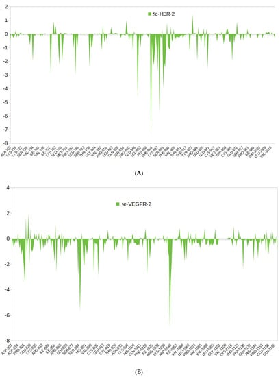 The per-residue contributions for the binding free energy of 5e with HER-2 (A) and VEGFR-2 (B).
