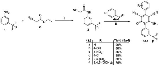 4.1.2. General Procedure for the Synthesis of 6-amino-4-(aryl)-2-oxo-1-(3-(trifluoromethyl)phenyl)-1,2-dihydropyridine-3,5-dicarbonitriles (5a-f)