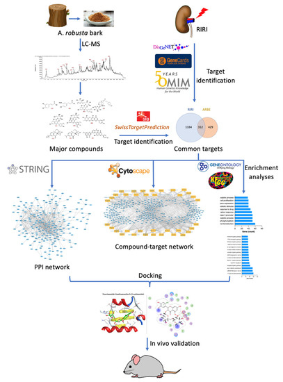 This study included a rational experimental design (Figure 1), involving the identification of the chemical composition profile of ARBE, using Liquid Chromatography combined with Electrospray Ionization Tandem Mass Spectrometry (LC-ESI-MS/MS). The identified compounds were subjected to in silico strategies, including network pharmacology as a modern method to investigate the interactions of active components with a disease’s molecular targets, followed by molecular docking analysis. The in vivo validation comprised a rat model of RIRI followed by functional and immunohistochemical analyses.