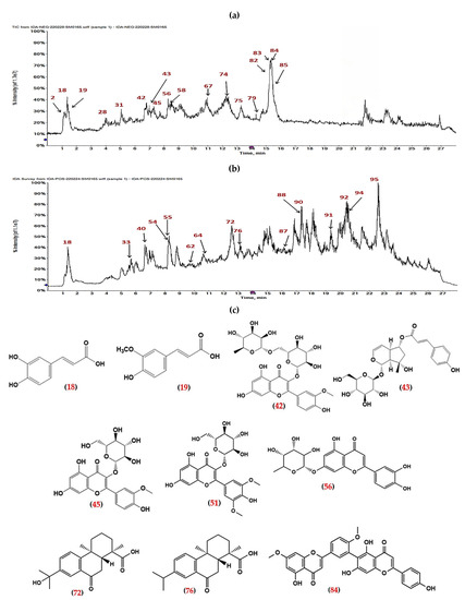 LC-MS total ion chromatograms of ARBE. (a) The TIC in negative ion mode. (b) The TIC in positive ion mode. (c) The structure of some LC-MS identified major components of ARBE. Numbers in red (in (a–c)) are related to Table 1.