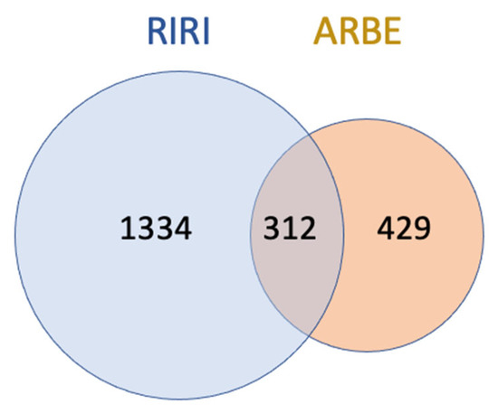 The common overlapping targets between ARBE major compounds and RIRI targets were identified in Microsoft Excel and represented as a Venn diagram.