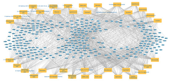 The molecular targets linked to the identified major compounds of AR were predicted using the SwissTargetPrediction (http://www.swisstargetprediction.ch/, accessed on 1 July 2022) database [87].