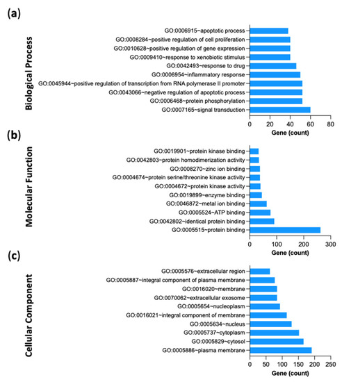 To verify the relevant biological and functional characteristics of the 312 disease-compound common targets, GO enrichment analysis was performed in biological processes (BP), molecular functions (MF), and cellular components (CC) based the number of targets that were enriched in those categories (Figure 6a–c). Top BP included signal transduction, inflammatory response and apoptotic process; Top MF included protein binding, enzyme binding, and protein kinase activity; Top CC included plasma membrane, cytoplasm, and nucleus. Detailed information of GO analyses is shown in Supplementary Tables S7–S9.