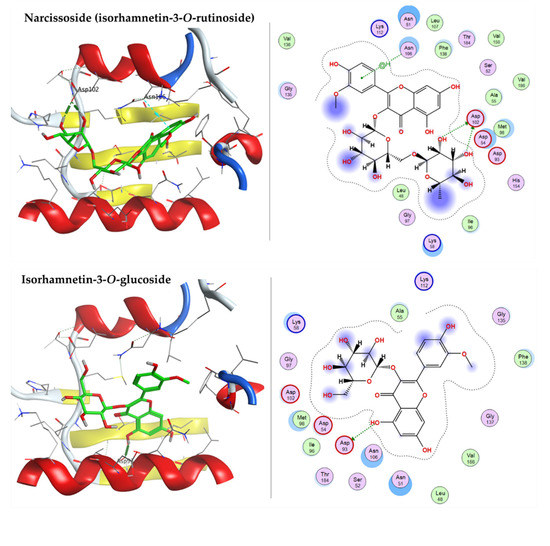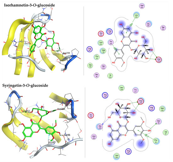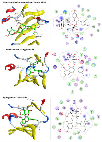 3D and 2D docking plots of narcissoside (isorhamnetin-3-O-rutinoside), isorhamnetin-3-O-glucoside, and syringetin-3-O-glucoside, respectively, on EGFR (PDB code: 1M17).