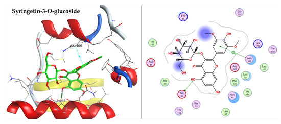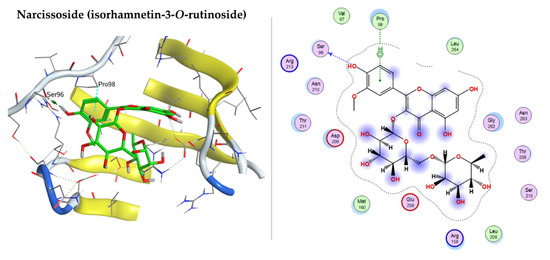 The P53 active pocket is lined with the following amino acid residues: PRO98, SER99, ARG158, ALA159, MET160, LEU206, ASP208, ARG213, SER215, ILE254, ILE255, THR256, GLU258, GLY262, LEU264, and ARG267. 7-Oxo-dehydroabietic acid, caffeic acid, narcissoside (isorhamnetin-3-O-rutinoside), isorhamnetin-3-O-glucoside, syringetin-3-O-glucoside, 15-hydroxy-7-oxo-dehydroabietic acid, 6-O-p-coumaroyl ajugol, luteolin 7-rhamnoside, robustaflavone 7,4′-dimethyl ether, and ferulic acid were docked into P53 (PDB code: 3Q01) with a good binding affinity to the active site, with the docking energy score ranging from −7.1544 to −4.5554 kcal/mol. The components confirmation within the active pocket stabilized by H-bond interaction with the amino acid residues. Table 5 shows the detailed amino acid residues involved in the H-bond and pi-H bond interactions with the docked components. Narcissoside (isorhamnetin-3-O-rutinoside), isorhamnetin-3-O-glucoside, and syringetin-3-O-glucoside have good binding interactions with the amino acid residues of the active pocket, represented on Figure 10.