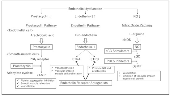 Basic research has revealed a decrease in the levels of endogenous vasodilators, such as prostacyclin, and an elevation in the levels of endogenous vasoconstrictors, such as endothelin, in patients with PAH, leading to the development of therapeutic agents. Currently, therapeutic agents for PAH target three pathways that are selective for PAs: the prostacyclin, endothelin, and nitric oxide (NO) pathways. These treatments have improved the PAH prognosis, which used to be 3 years [4]. In this review, we describe new drug therapies and introduce an outline of the therapeutic agents used at present.