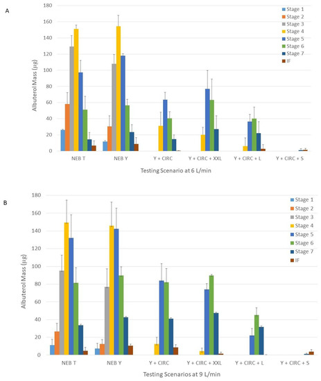 Drug distribution across the different stages of the Next Generation Impactor with nebulizers with the Tee-piece, with the Tee-piece connected to the Y-piece, with the Tee-piece connected to the Y-piece connected to the humidifier and circuit, and with the Tee-piece connected to the Y-piece connected to the humidifier, circuit, and small, large, and XXL cannulas and operated at 6 (panel (A)) and 9 L/min (panel (B)), respectively. Panel A = 6 L/min. Panel B = 9 L/min. NEB T = nebulizer with the Tee-piece. NEB Y = nebulizer with the Tee-piece connected to the Y-piece. Y + CIRC = nebulizer with the Tee-piece connected to Y-piece connected to the humidifier and circuit. Y + CIRC + XXL = nebulizer with the Tee-piece connected to the Y-piece connected to the humidifier, circuit, and XXL cannula. Y + CIRC + L = nebulizer with the Tee-piece connected to the Y-piece connected to the humidifier, circuit, and large cannula. Y + CIRC + S = nebulizer with the Tee-piece connected to the Y-piece connected to the humidifier, circuit, and small cannula.