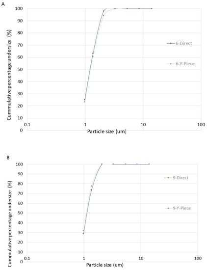 Plot of the logarithmic particle size against the cumulative percentage undersize for aerosols released by a large cannula when the nebulizer with Tee-piece was operated at 6 L/min (panel (A)) and 9 L/min (panel (B)) and connected to the humidifier directly or via Y-piece. Panel A = 6 L/min. Panel B = 9 L/min. 6-Direct = nebulizer operated at 6 L/min with the Tee-piece attached directly to the humidifier connected to circuit and large cannula. 6-Y-piece = nebulizer operated at 6 L/min with the Tee-piece attached to a Y-piece connected to the humidifier connected to circuit and large cannula. 9-Direct = nebulizer operated at 9 L/min with the Tee-piece attached directly to the humidifier connected to the circuit and large cannula. 9-Y-piece = nebulizer operated at 9 L/min with the Tee-piece attached to a Y-piece connected to the humidifier connected to circuit and large cannula.