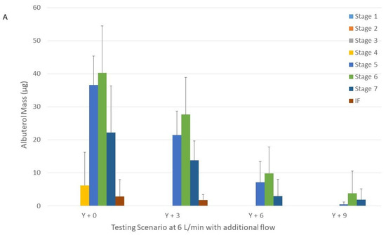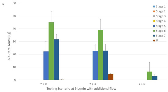 Drug distribution among the different stages of the Next Generation Impactor with nebulizers with Tee-piece operated at 6 (panel (A)) and 9 L/min (panel (B)) connected to a Y-piece connected that was to the humidifier, circuit, and large cannula with and without additional flow. Panel A = 6 L/min. Panel B = 9 L/min. Y + 0 = nebulizer with Tee-piece connected to a Y-piece that was connected to the humidifier, circuit and large cannula without additional flow. Y + 3, Y + 6, and Y + 9 were similar to Y + 0, except that they had 3, 6, and 9 L/min of additional flow, respectively provided through the Y-piece.