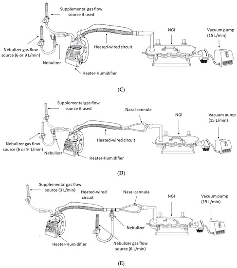 (A) Nebulizer with the Tee-piece connected to the induction port of the Next Generator Impactor (NGI). (B) Nebulizer with the Tee-piece connected to the Y-piece and connected to the induction port of the Next Generator Impactor (NGI). (C) Nebulizer with the Tee-piece connected to the Y-piece, connected to the humidifier inlet, connected to the heated-wired circuit and connected to the induction port of the Next Generator Impactor (NGI). (D) Nebulizer with Tee-piece connected to Y-piece, connected to the humidifier inlet, connected to the heated-wired circuit, connected to nasal cannula that was connected to the induction port of the Next Generator Impactor (NGI). (E) Nebulizer with Tee-piece placed between the heated-wired circuit and a large cannula that was connected to the induction port of the Next Generator Impactor (NGI).